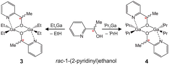 2.3. Structure of rac-[R2Ga(µ-OCH(Me)C5H4N]2 (R = Et (3), iPr (4))