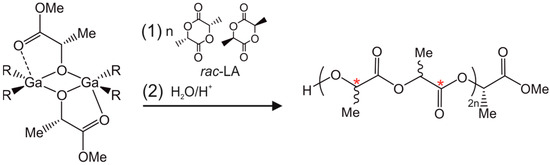 ROP of rac-LA with (S,S)-[R2Ga(µ-OCH(Me)CO2Me]2 (R = Me, Et and iPr). Red stars indicate chiral centers in the PLA.