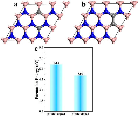 The obtained result of the formation energy is shown in Figure 1c. The formation energy for C-doped h-BN at the para-position and ortho-position is 6.61 eV and 5.07 eV, respectively, which demonstrates that the C-doped h-BN with the ortho-position is more stable.
