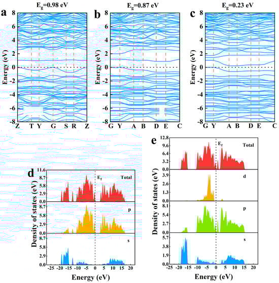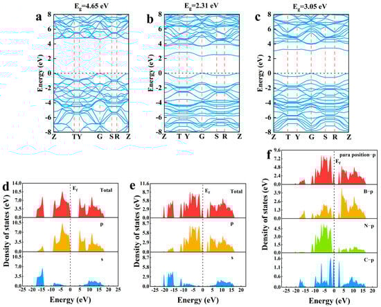 The electronic structure of the crystal model, such as the band structure and the density of states (DOS), is usually calculated to explore the characteristics of electron motion and the energy states of electrons. The calculated results of band structure of undoped h-BN are shown in Figure 2a. The band gap for undoped h-BN is 4.65 eV. The calculated results of the band structure of two C-doped BN models are shown in Figure 2b,c. It can be observed that the band structures of two models do not pass through the Fermi level, indicating the forbidden band exists. The band gap for the para-position and ortho-position is determined to be 2.31 eV and 3.05 eV, respectively, which is obviously low compared with the undoped h-BN, indicating that the band gap of h-BN can significantly reduce when the C atoms with the same concentration are doped at different positions of h-BN. Furthermore, the result shows that the forbidden band width of the para-position is lower than that of the ortho-position, which means that the band gap of h-BN can be regulated more effectively by para-position C doping.