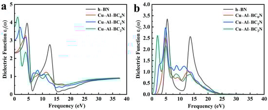 (a) Real parts and (b) imaginary parts of complex dielectric function for h-BN and Cu-Al co-doped BCxN.