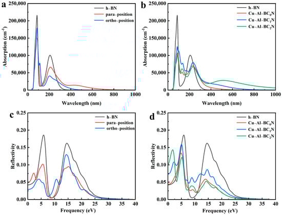 The absorption and reflection spectra of the C-doped h-BN at different positions and the Cu-Al co-doped BCxN are shown in Figure 6a–d. The higher the absorption rate means the more electrons transition from the ground state to the excited state, which further reflects the better optical responsiveness of the materials. As seen in Figure 6a,b, the absorption spectrum of the undoped h-BN can hardly be seen in the visible range of 360–780 nm, indicating that the undoped h-BN cannot absorb visible light. Noteworthily, with the increase in C atom concentration, the absorption spectrum red-shifts towards the visible light region due to the band gap reduction []. In addition, the Cu-Al co-doped BC2N exhibits the best response ability to the visible light region, and the absorption wavelength is increased more obviously. In addition, the higher reflectivity implies that the more the electrons transition to the excited state, then the more the electrons go back to the lower energy level by releasing energy. Figure 6c,d show the reflection spectrum. It can be found that the main reflection is in the range of 0–14.60 eV. When the photon energy is 0, the reflectivity of undoped h-BN and C para and ortho-doped h-BN is 0.042, 0.049 and 0.028, respectively. The reflectivity of Cu-Al co-doped BCxN (x = 0, 1 and 2) is 0.044, 0.073 and 0.103, respectively. Compared with the reflection spectra of the undoped h-BN and the C alone-doped h-BN, the reflection ability of Cu-Al co-doped BCxN increases significantly in the range of 0–1.5 eV, which reveals the Cu-Al co-doped BCxN system reflects infrared light more strongly.