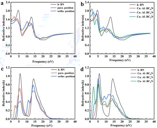 Complex refractive indexes and extinction coefficients can be described with a complex refractive index as N = n + ik [], where the real part (n) is the refractive index, and the imaginary part (k) is the extinction coefficient. It is well known that the curves of n and k for all h-BN systems are very similar to ε1(ω) and ε2(ω) of the complex dielectric function system []. As can be seen from the refractive index in Figure 7a,b, the refractive indexes of Cu-Al co-doped BCxN are better than that of C alone-doped h-BN in the high-frequency range (5–15 eV). However, the refractive indexes of Cu-Al co-doped BCxN are weaker than that of pure h-BN in the high-frequency range. However, their peak widths increase in the high-frequency range. It is observed that the refractive index peaks of C alone-doped h-BN and the Cu-Al co-doped BCxN in the low-frequency range (0–5 eV) are red-shifted compared to that of undoped h-BN. The red-shifted effect of Cu-Al co-doped BCxN are more obvious than that of C alone-doped h-BN in the low-frequency range. As shown in Figure 7a, the most refractive index of undoped h-BN, C para and ortho-doped h-BN is 4.55 eV, 2.02 eV and 3.44 eV, respectively. The most refractive indexes of Cu-Al co-doped BCxN are at about 3.89 eV, 1.96 eV and 1.28 eV. After the frequency of refractive index reaches the peak, with the increase in photon energy, the refractive index decreases rapidly and shows a trend of fluctuation and finally becomes stable. Figure 7c,d show the extinction coefficient. In Figure 7d, when the photon energy is 0–3 eV, the extinction coefficient increases with the increase in C atom doping concentration. In Figure 7c,d, it can be found that the intensities of the low-frequency peaks of C alone-doped h-BN and the Cu-Al co-doped BCxN decrease compared to that of undoped h-BN. In addition, the low-frequency peaks of Cu-Al co-doped BCxN shift slightly to low energy.