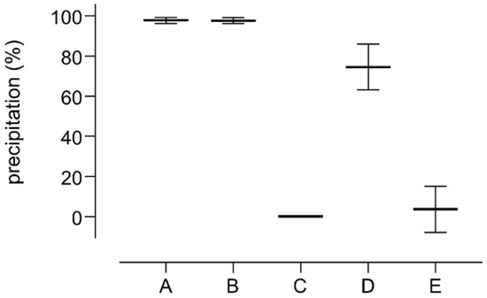 Precipitation yields obtained on samples of 2.5 mg/mL proteins: pure HSA dissolved in 5 mM MES buffer (A); mouse brain homogenate obtained in 5 mM MES buffer (B); mouse liver homogenate obtained in 5 mM MES buffer (C); mouse brain homogenate obtained in 5 mM phosphate buffer (D and E). Samples A–D were treated with 5 mM of zinc chloride, followed by 5 mM NaOH; sample E was treated with 50 mM zinc chloride, followed by 50 mM NaOH.