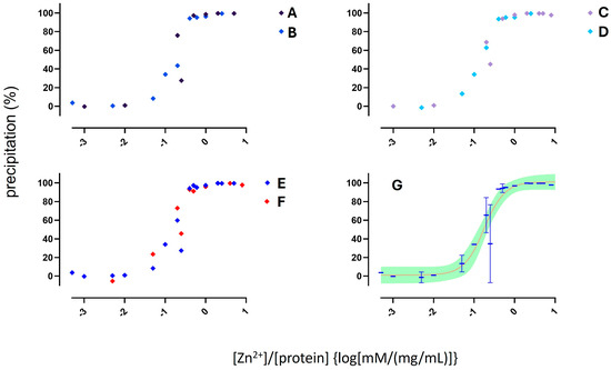 The relative concentration of reagents was optimized for each metal, as already described for zinc. All metals were ineffective when an excess or deficiency of base was added, and all of them have a sigmoidal curve similar to Figure 3(G). However, the F test rejected the null hypothesis that the whole dataset is fitted by a single curve. The preferred model was built by four independent sigmoidal curves, each one grouping data obtained by using the same metal as a precipitating regent. Table 1 allows for a comparison between the performance of the different metals as precipitating agents for proteins.