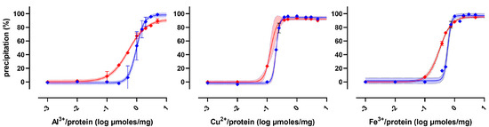 Preferred fitting model of precipitation induced by hydroxides of Fe(III), Cu(II), or Al: separated nonlinear regression with 95% confidence bands for data collected using albumin (blue lines) or serum (red lines).