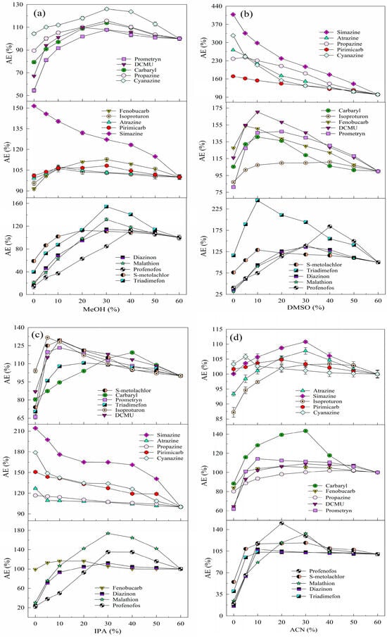 - The effectiveness of reducing the AE varies with different addition ratios of organic solvents. Among them, 30% MeOH, 10% DMSO, 10% IPA, 20% ACN, and 5% ACE can effectively reduce the effect of AE on the detection signal intensity of a variety of organic pesticides in aqueous solutions, with MeOH showing the best performance.