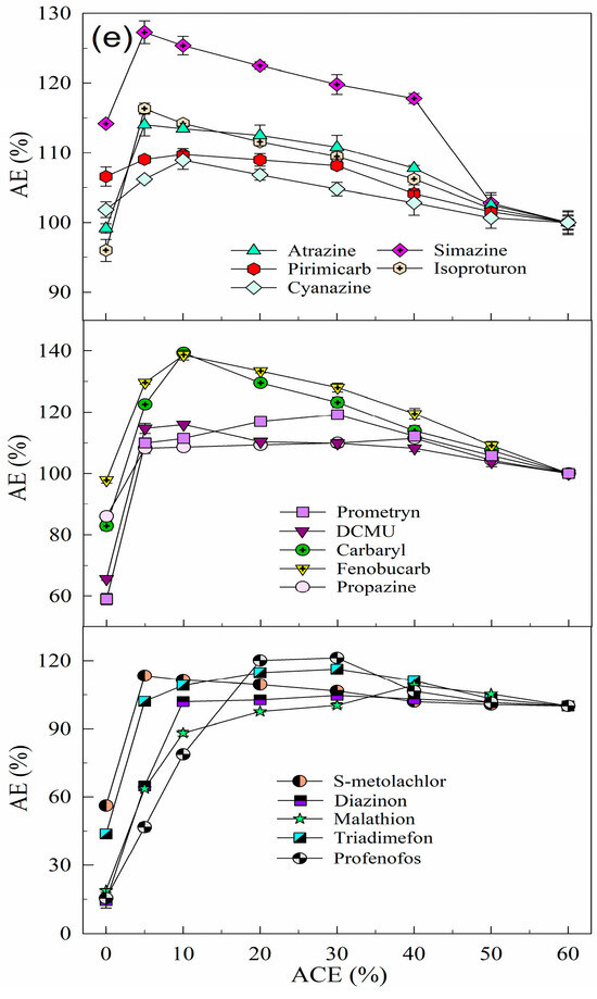 ACE, the simplest saturated ketone [39], is soluble in water and organic solvents, and significantly affects water structure by reducing hydrogen bonding [40]. Figure 1e shows that the detection signal intensity of 15 pesticides initially increased and then decreased with increasing ACE ratios in aqueous solutions. Specifically, 5% ACE effectively reduced the adverse effect of AE on the detection of simazine, atrazine, isoproturon, propazine, and S–metolachlor; 10% of cyanazine, carbaryl, pirimicarb, DCMU, fenobucarb, and diazinon; 20% of profenofos; 30% of prometryn and triadimefon; and 40% of malathion. Excessive ACE reduced the detection signal intensity of target analytes due to competition for solvent binding, inhibition of ion generation, and chromatographic peak areas [22]. In summary, the use of 5% ACE–UPW as a solvent effectively increased the detection signal intensity and reduced the adverse effects of AE for most of the 15 pesticides.