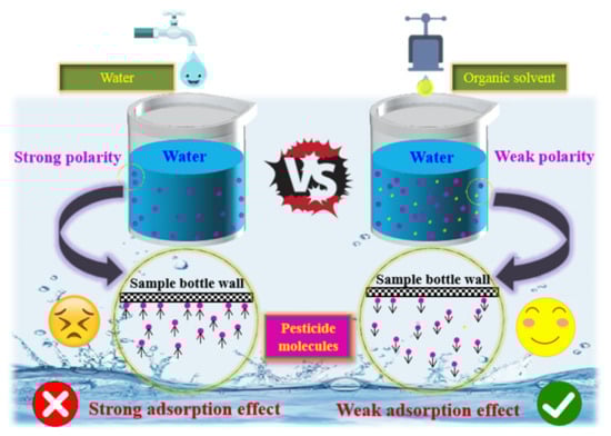 The objectives of this study are to identify the factors causing errors in the detection of organic pesticides in aqueous solutions, to investigate the effect of organic solvent types and ratios on the detection signal intensity of the analytes, to assess the effect of injection vial materials and the mitigating effects of organic solvents on the AE, and to validate the effectiveness of organic solvent addition in reducing the adverse effects of the AE on the detection of organic pesticides in real water samples.