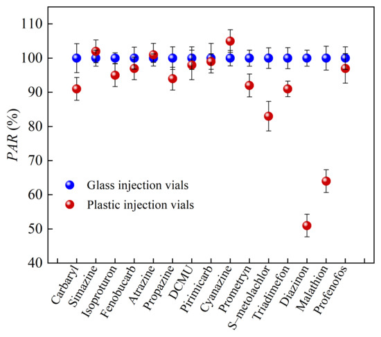- To investigate the effect of injection vial material, the detection signal intensity of 15 pesticides was first measured at a concentration of 2.5 μg/L for each pesticide in glass and plastic material injection vials, and the PAR of the target pesticide in plastic injection vials was calculated to indicate the effect of injection vial material on the detection signal intensity of the analyte, based on the peak area of the analyte measured in glass injection vials as 100%.