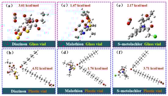 DFT calculation model diagram: (a) diazinon–glass vial, (b) diazinon–plastic vial, (c) malathion–glass vial, (d) malathion–plastic vial, (e) S–metolachlor–glass vial, and (f) S–metolachlor–plastic vial.