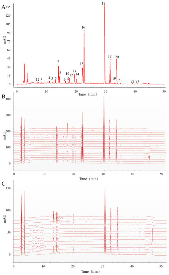 Fingerprint technology is essential for quality control in traditional Chinese medicine [24]. The fingerprints of both non-sulfur-fumigated and sulfur-fumigated ADR are illustrated in Figure 1. The reference fingerprint is depicted in Figure 1A, while the HPLC chromatogram of mixed reference substances is shown in Figure S1. The fingerprint identified a total of 23 common peaks, which correspond to ten calibrated components. The chromatographic conditions resulted in a rapid analysis time, symmetric and narrow peak shapes, and a separation factor greater than 1.6 for reference compounds.