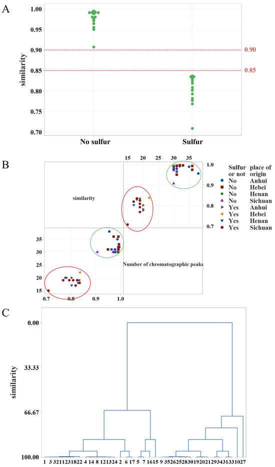 Sulfur fumigation is commonly employed to dry ADR and can significantly impact its quality. While many studies have reported on ADR fingerprints [25], there is limited research on sulfur-fumigated ADR. Numerous chromatographic peaks were clearly absent in ADR following sulfur fumigation (Figure 1C).