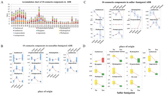 Content of coumarins in ADR. (A) Accumulation chart of 10 coumarin components in ADR; (B) box plot of 10 coumarins in non-sulfur-fumigated ADR; (C) box plot of 10 coumarins in sulfur-fumigated ADR; (D) effects of sulfur fumigation on coumarins in ADR.