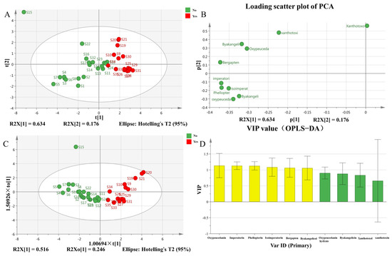 PCA and OPLS-DA analysis of ADR. (A) Score scatter plot of PCA; (B) loading scatter plot of PCA; (C) score scatter plot of OPLS-DA; (D) VIP value.