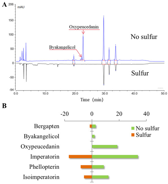 ADR was cultivated in a well-known production area (Anguo, China). Subsequently, both natural drying and sulfur fumigation were applied to ADR cultivated in the same area. Figure 5 compares HPLC chromatographic peaks and the peak areas of the six markers. As shown in the figure, sulfur fumigation resulted in the loss of byakangelicol and oxypeucedanin. This phenomenon may result from hydrolysis reactions of coumarins and other lactone-containing components in ADR under acidic conditions. These components may serve as markers to indicate whether ADR has undergone excessive sulfur fumigation.