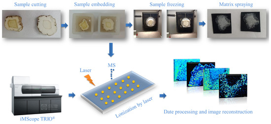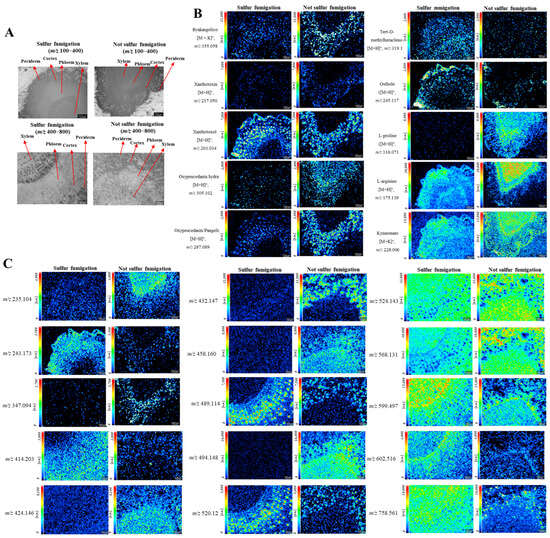 A slightly modified standard procedure was used to prepare ADR sections. Sulfur-fumigated and non-sulfur-fumigated ADR samples were cleaned and cut into 1 cm segments. The segments were embedded in 10% gelatin and stored at −80 °C for two hours. Sectioning was performed using a microtome (Leica CM1950, Nussloch, Germany). The sample was first attached to the holder with optimal cutting temperature compound (OCT), then placed on an ultralow-temperature quick-freezing table (−22 °C) in the slicer for 5 min prior to sectioning. Subsequently, 30 μm sections were prepared and transferred onto conductive glass slides. After vacuum drying for 20 min, the glass slide was fixed to the holder and transferred to an automatic matrix sublimation instrument (iMLayer, Shimadzu, Kyoto, Japan) for matrix application. α-Cyano-4-hydroxycinnamic acid (CHCA) was deposited at 250 °C with a thickness of 0.7 μm.