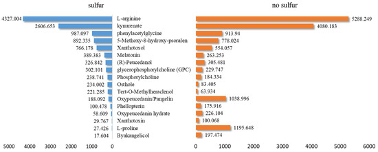 The mass spectrum response values for some analyzed components are presented in Table S4. According to the data, a bar chart was created (Figure 8). Paired t-test analysis indicated a significant difference in the MALDI-MSI response values before and after sulfur fumigation (p < 0.001).