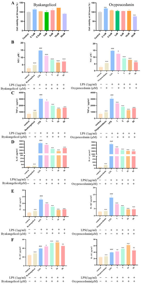 In vitro validation of byakangelicol and oxypeucedanin. (A) Effects of byakangelicol and oxypeucedanin on the viability of RAW264.7 cells; effect of byakangelicol and oxypeucedanin on the production of NO (B), TNF-α (C), IL-6 (D), IL-1β (E), and IL-10 (F) in LPS-induced RAW264.7 cells. The results represent the mean ± SEM (n = 3), * p < 0.05, ** p < 0.01, *** p < 0.001 (vs. LPS), ### p < 0.001 (vs. Control), ns: not significant.