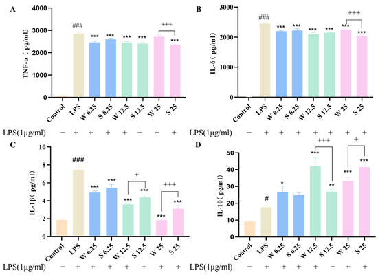 There are rich coumarins in ADR. Coumarins and isocoumarins are known to act as anti-inflammatory molecules [19,30]. Moreover, the anti-inflammatory activity of ADR before and after sulfur fumigation was also investigated. ADR showed anti-inflammatory activity regardless of sulfur fumigation. However, the effects of non-sulfur-fumigated ADR and sulfur-fumigated ADR on the production of cytokines TNF-α, IL-6, IL-1β, and IL-10 in LPS-induced RAW264.7 cells were different (Figure 10). Non-sulfur-fumigated ADR showed a better reduction effect than sulfur-fumigated ADR for TNF-α at 6.25 μg/mL (Figure 10A) and for IL-6 at 6.25 μg/mL, 12.5 μg/mL (Figure 10B). For the cytokine IL-1β, non-sulfur-fumigated ADR (W 6.25, W 12.5, W 25) showed better effects on reducing inflammatory factors (Figure 10C). Non-sulfur-fumigated ADR showed a better elevation of anti-inflammatory cytokine IL-10 with the concentration of 6.25,12.5 μg/mL (Figure 10D). However, high concentration of sulfur-fumigated ADR (S 25 μg/mL) also showed good effects of down-regulating the levels of pro-inflammatory cytokines TNF-α and IL-6, while up-regulating the level of the anti-inflammatory cytokine IL-10. This indicated that although sulfur fumigation leads to the reduction in or disappearance of some components in ADR, the high concentration of sulfur-fumigated ADR still had some anti-inflammatory activity, but it cannot be shown that sulfur fumigation is reliable, and a comprehensive investigation is still needed.