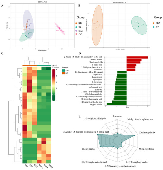 Difference in metabolites in blood in sulfur-fumigated and non-sulfur-fumigated ADR. (A) PCA; (B) OPLS-DA analysis; (C) heatmap cluster of ADR; (D) fold change bar chart; (E) radar chart.