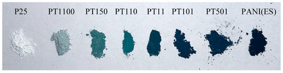 Commercially available P25 titania was used as a base to prepare the resultant photocatalysts (PANI/TiO2) by in situ oxidative polymerization of aniline. Different molar ratios between aniline and P25 were investigated: 1:100, 1:50, 1:10, 1:1, 10:1, 50:1, and 100:1. The color of PANI-TiO2 composites varies depending on the oxidation state of PANI and the interaction with titania. PANI, in its leucoemeraldine (LEB) state, appears as white or pale yellow. In the pernigraniline (PB) state, the material is purple or deep blue. In the EB state, the undoped semi-oxidized form usually appears blue or bluish-purple. Considering the ES form of polyaniline, a green color was reported [46,47]. The bare PANI obtained by the oxidative polymerization method had a dark green color, which is in agreement with the literature reports on the ES form (Figure 1). With varying PANI:TiO2 ratios, the resultant composite colors changed gradually. At higher PANI contents (100:1, 50:1, and 10:1), the samples exhibited deep dark green shades, closely resembling pure ES. At a balanced ratio (1:1), the color turned to green, reflecting the mixture of PANI and TiO2. At lower PANI contents (1:10, 1:50, and 1:100), the samples became progressively lighter, appearing light green and grayish-green for PT150 and PT1100 samples, respectively. The color gradient highlights the diminishing visual contribution of PANI as its content decreases (Figure 1).
