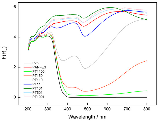 UV-Vis diffuse reflectance spectra of obtained PANI/TiO2, pure PANI-ES, and P25 samples are shown in Figure 2. It is clearly visible that PANI/TiO2 materials absorbed both UV and visible light, whereas unmodified P25 absorbed only UV light. The DRS spectrum of PANI-ES was in agreement with the spectrum reported in the literature [48]. Two absorption peaks around 385 nm and 638 nm were visible on this spectrum. The first was related to the π→π* transition on the PANI chains, and the second one was contributed to polaron after proton doping and corresponds to the localization of electrons [49]. It is important to mention that for polyaniline–titania heterostructures with lower PANI:TiO2 ratio (PT150, PT110, and PT11), the peak at 385 nm red-shifts to ca. 430–440 nm, and the peak at 638 nm was replaced by a broad absorption band with a long tail. In the case of the sample with the lowest content of PANI (PT1100), the peak at ca. 430–440 nm also disappeared. Describing the absorption spectra of samples with high content of polyaniline (PT101, PT501, and PT1001), they were similar to pure PANI, indicating the complete coverage of titania surface.
