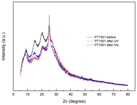 XRD diffractograms of PT1001 sample: before the photocatalytic experiment, after UV, and after visible light-induced experiments.