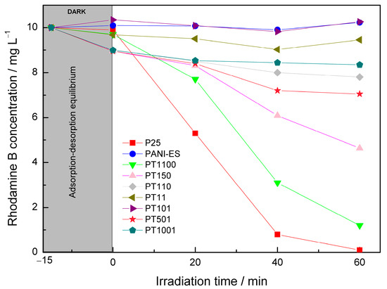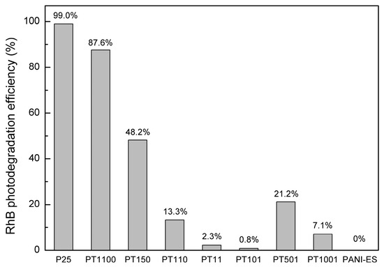 The photocatalytic properties of the prepared titania-polyaniline heterostructures were tested under both UV and visible light. In the UV system, rhodamine B (RhB) was selected as a model compound. Figure 5 shows the time course of photocatalytic reactions in the presence of the prepared heterostructures in the UV system. The corresponding photodegradation efficiencies are presented in Figure 6. The activities were compared with pure P25 and synthesized bare polyaniline in the ES form (PANI-ES). The most efficient photocatalyst in this system was pure P25. Almost all of the amount of RhB was degraded within an hour. On the contrary, PANI-ES had no UV-induced photocatalytic activity. Figure 6 clearly shows the negative impact of PANI content on photodegradation efficiencies (PEs) of PANI/TiO2 materials. PEs of 87.6% and 48.2% were reported for PT1100 and PT150 samples, respectively. In the case of samples with higher content of PANI, PEs in the range of 0.8 to 21.2% were observed.