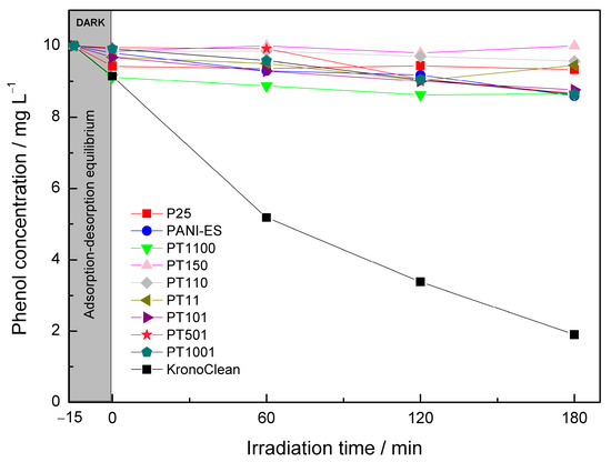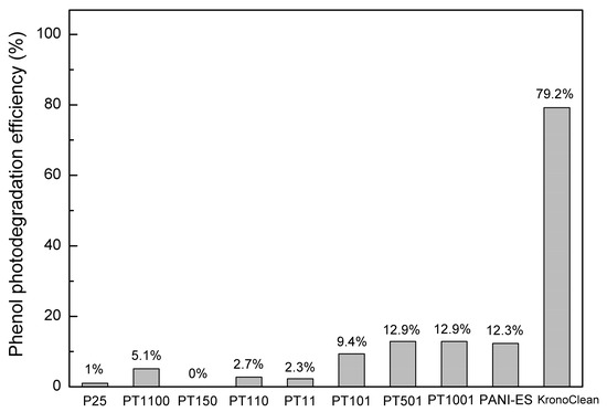 The photocatalytic activity of the prepared titania–polyaniline materials was also tested under visible light (4000 K-LED source). In contrast to the previous system, phenol was used as a model organic compound. As mentioned in the introduction, it is not recommended to use dyes in the Vis-system. The photocatalytic activity of the prepared samples in this reaction configuration is shown in Figure 7. Carbon-modified KronoClean titania in the anatase form with visible light activity was used as a reference material. For this sample, 79.2% of phenol was degraded after 180 min of visible light irradiation, justifying the use of an experimental setup based on the selected light source. Unlike the UV system, pure PANI-ES has activity in visible light that is at a low level compared to KronoClean—only 12.3% of PANI-ES degraded. Figure 8 shows the calculated PEs for all samples tested. It can clearly be seen that the higher content of PANI-ES was beneficial for the better visible light activity of PANI/TiO2 samples. PEs for PT501 and PT1001 samples were 12.9%, and were close to the efficiency level for pure PANI-ES. It is difficult to conclude a clear improvement in PE here since the difference in the PEs of these two samples is at the level of measurement error. For the sample PT101, the reaction efficiency decreased to 9.4%. In the case of samples with lower PANI content, PEs were observed in the range of 0 to 5.1%. Phenol photodegradation efficiency for pure P25 titania was 1%. Regarding the slightly higher activity of the PT1100 sample (5.1%) compared to the other samples (PT150, PT110, and PT11), due to the low-efficiency value and measurement error, it is difficult to conclude here that there was a significant improvement in activity compared to them and pure P25.