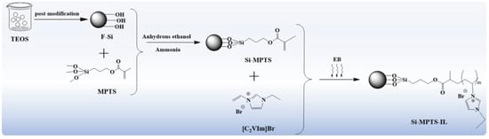 Firstly, Si-MPTS was prepared based on our previous work [], and the synthesis route is illustrated in Figure 1. Secondly, 0.1g of Si-MPTS was weighed into a polyethylene bag for vacuum sealing, and then the 30 wt% [C2VIm]Br was injected under the condition of nitrogen flow deoxidation. The electron accelerator (WasiK, USA, Energy 1 MeV, 20 kGy/pass) was used for beam irradiation at 120 kGy. After irradiation, non-reactive monomers and homopolymers were washed for several times with deionized water and anhydrous ethanol. Finally, Si-MPTS-IL was obtained by centrifugation and dried at 50 °C (the specific reaction details are given in Supporting Information). The conversion rate of the functionalization process can be quantified using Equation (2):
