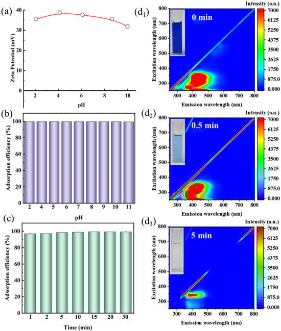 Zeta potential of Si-MPTS-IL (a); Effect of pH (b) and contact time (c) on CBB uptake; (d) 3D fluorescence spectrogram during adsorption on Si-MPTS-IL.