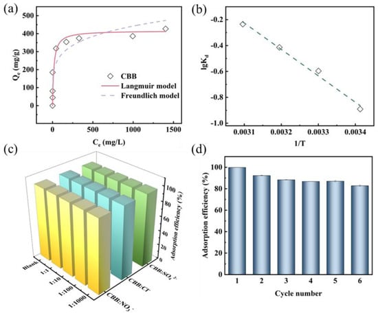 To assess the adsorption capacity, the Langmuir (Equation (S3)) and Freundlich (Equation (S4)) models are selected to fit the isothermal data. The fitting plots and parameters are presented in Figure 4a and Table S3. Upon comparing the R2 values and adsorption capacity, the Langmuir model (R2 > 0.99) proved suitable for describing the CBB removal, indicating the predominance of monolayer adsorption in the process. The maximum adsorption capacity of Si-MPTS-IL for CBB is 414.44 mg/g, exceeding the values reported for other adsorbents in prior studies (Table S1) [,,,,]. Additionally, the effect of temperature on the adsorption performance is explored in Figure 4b and Table S4. The study reveals that the adsorption process of CBB onto Si-MPTS-IL is endothermic. In summary, Si-MPTS-IL is regarded as having excellent adsorption performance, making it a promising candidate for the treatment of wastewater containing CBB.