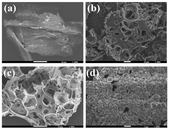 In order to investigate the morphological structure of the prepared carbon materials, the surface morphological structure of the most representative nanoporous carbon and hydro-char samples was observed by SEM, revealing the influence of raw material ratio and reaction conditions on the surface texture of carbon materials (Figure 1). In Figure 1a, the inactivated hydro-char M-25 shows a pyknotic structure with a rough surface and no pore size, which affects its application in the field of electrochemistry. Activated carbon material M-2-25 (Figure 1b) has a porous structure with a variety of pore shapes, but the distribution of these pores is not uniform enough, indicating that the degree of activation is not complete. At a higher activation ratio, a more developed pore structure of M-3-25 was observed (Figure 1c). This pore structure was more evenly distributed on the “honeycomb-like” porous carbon, compared to other samples. The developed pore structure and the addition of heavy metal elements can adjust the electrochemical activity and specific surface area of the electrode material, optimizing the electrochemical performance [32,33]. Energy dispersive spectral analysis (EDS) was carried out on M-3-25 (Figure S1, Supplementary Materials). The results of element spectra showed that the distribution of C, N, O, and Cu elements was uniform, indicating that the nitrogen and heavy metal elements were successfully doped into the nanoporous biochar in the process of sample preparation. With the increase of Cu content in the sample, there are obvious granular sediments in some pores of M-3-50, which occupy the pore structure of nanoporous carbon (Figure 1d). A clogged pore can lead to a decrease in specific surface area and active sites, the blockage of ion transport, and a decrease in electrochemical stability. The M-4-25 (Figure S2) showed a collapsed pore structure, the relatively poor pore structure indicating that too high an activation ratio is not conducive to the development of the pore structure. Compared with pine sawdust not compounded with goose feather, the sample with moderate heavy metal content after composite (M-3-25) has the best morphology and best developed pore structure, which has great potential for electrochemical application.