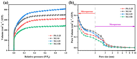 The specific surface area and pore structure distribution of activated carbon samples were analyzed by the N2 absorption–desorption method. All samples showed a combination of types I and IV isotherms (Figure 2a), and hysteresis loops were relatively insignificant, possibly because pore size distribution in the material was relatively uniform and microporous [34,35], which is consistent with the results in Table 1. At low relative pressure (P/P0 < 0.05), the isotherms exhibited a sharp increase in adsorption capacity, indicating the presence of abundant micropores. However, at high relative pressure (P/P0 > 0.4), the adsorption and desorption processes are not completely reversible, and there is a weak hysteresis effect, which is shown as an H4 hysteresis loop with a certain mesoporous structure. All the samples had abundant hierarchical microporous (under 2 nm) and mesoporous (2–50 nm) structures (Figure 2b). The high specific surface microporous area increases the contact area between the electrode and the electrolyte, improving the charge transport and the electrochemical reaction rate. At the same time, the mesopore provides enough space for the ion transport in the material, which means that the prepared carbon material can be used as an excellent ion transport channel and improve electrochemical performance [36,37]. The rise in specific surface area of PS-3-0 and M-3-0 (1327.36 and 2309.43 m2/g) is due to feather biomass, as an additional auxiliary material, having a high protein and nitrogen content. During pyrolysis, these elements form volatile nitrogen compounds that deposit in pores, enhancing pore size distribution and complexity [38]. For M-2-25 and M-4-25, the increase in the proportion of activators enables more KOH to participate in the pyrolysis reaction and produce more H2, CO2, etc., which contributes to the generation of micropores and mesopores. Nevertheless, at excessive KOH, the carbon skeleton of M-4-25 may be destroyed by KOH erosion, and the pore structure collapses to form a blockage, which cannot effectively improve electrochemical performance. In addition, we found that, with the increase of Cu content in the sample, the specific surface of M-3-0, M-3-25, and M-3-50 continued to decline, (2309.43, 25.1.08, 1555.15 m2 g−1). This is because, when the dose of copper is small, the uniform distribution of copper particles has little influence on the pore channels. At the same time, the catalytic action of copper particles may promote the graphitization of carbon materials, and at the same time produce gases, leaving micropores in the carbon materials. When the dose of copper increases, more copper particles block the pore structure on the surface of the carbon material, resulting in a decrease in the specific surface area [39,40]. Overall, the activated carbon materials have a high specific surface area and abundant pore structure. Activation ratio and heavy metal content can affect the structural properties of nanoporous carbon, and then affect its electrochemical performance. The performance of the activated carbon electrode material was well regulated by adjusting the two reaction conditions.