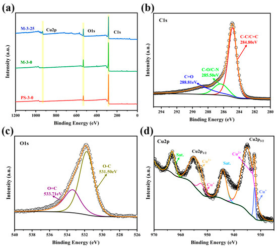 (a) Full-scan XPS measurement spectra of samples. (b–d) Fine spectra of C 1s, O 1s, and Cu2p of M-3-25.