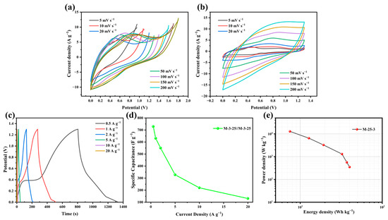 Electrochemical performance of samples in the three-electrode system. (a) GCD curves, (b) GCD curves of M-3-25 at different densities from 0.5 to 20 A g−1, (c) CV curves, (d) CV curves of M-3-25 at different scanning rates from 5 to 200 mV s−1, (e) specific capacitance of M-3-25 at different current densities, (f) electrochemical cycle test of M-3-25 at 10 A g−1.