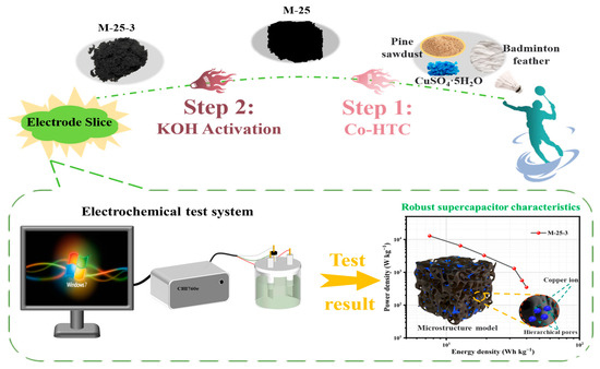 Since the industrial revolution, the excessive consumption of fossil fuels, including coal, oil, and natural gas, has triggered global environmental problems, encompassing an energy crisis and global warming, which has stimulated the exploration of new alternative energy sources [12,13,14]. Supercapacitors (SCs) with fast charging speed, long cycle life, high energy density and power density, and geared towards green environmental protection, provide a promising method for the rapid storage of renewable energy and show a wide range of applications in new energy power generation systems, consumer electronics, automotive transportation and other fields [15,16,17]. Feathers from poultry used in badminton, such as goose feathers, chicken feathers, duck feathers, etc., have an extremely high nitrogen content [18]. Doping them into biochar as an exogenous nitrogen element can not only omit the chemical nitrogen doping steps, but also increase the content of heteroatoms in biochar, enrich its pore structure and surface active sites, and improve its stability [19,20,21,22]. How to utilize discarded sports equipment, specifically badminton shuttlecocks, as a potential recyclable resource and to compound it as an auxiliary material into the preparation process for biochar, proposing reasonable resource utilization measures, and producing excellent nitrogen-rich electrode materials, is a project full of hope and challenge.