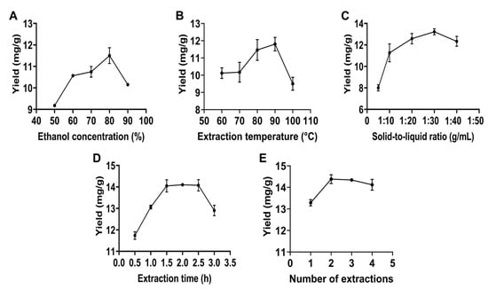Effect of single factors on total flavonoid yield of Polygonum perfoliatum L. (A) Ethanol concentration; (B) extraction temperature; (C) solid-to-liquid ratio; (D) extraction time; (E) number of extractions.