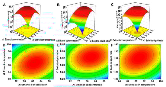 Response surface and contour plots between response variables in Box–Behnken. The 3D surface map (A) and the response surface contour diagram (D) for the interaction of ethanol concentration and temperature on the extraction efficiency of the total flavonoids from the Polygonum perfoliatum L. The 3D surface map (B) and the response surface contour diagram (E) for the interaction of ethanol concentration and solid-to-liquid on the extraction efficiency of the total flavonoids from the Polygonum perfoliatum L. The 3D surface map (C) and the response surface contour diagram (F) for the interaction of temperature and solid-to-liquid on the extraction efficiency of the total flavonoids from the Polygonum perfoliatum L.