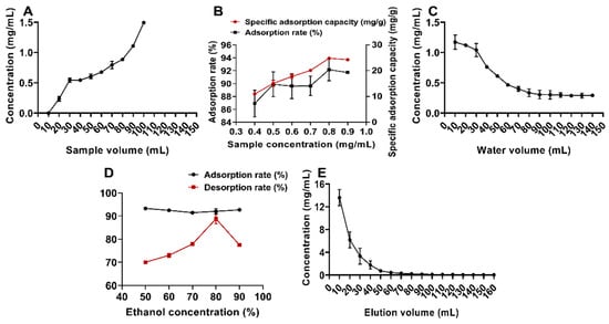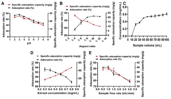 One-factor adsorption experiments with macroporous resins. (A) pH screening; (B) diameter-to-height ratio; (C) seepage curve; (D) sample concentration; (E) sample flow rate.
