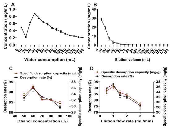 The effect of different ethanol concentrations on the desorption capacity was studied, as shown in Figure 5C. The desorption capacity increased initially and then decreased with rising ethanol concentration, peaking at 60%. It was speculated that lower ethanol concentrations might be insufficient to effectively compete for adsorption sites on the resin, resulting in inadequate desorption. Conversely, excessively high ethanol concentrations could reduce the solubility of flavonoids, leading to incomplete elution []. Therefore, 60% ethanol was selected as the eluent.