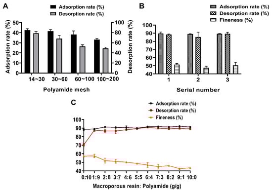 One-factor investigation of macroporous resins in combination with polyamides. (A) Polyamide mesh number; (B) comparison of the order of association; (C) dose ratio.