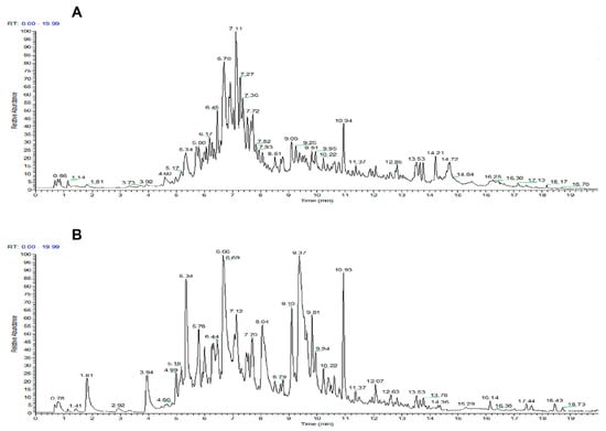 Total ion flow chromatograms of the purified flavonoids of Polygonum perfoliatum L. in (A) positive ion mode and (B) negative ion mode.