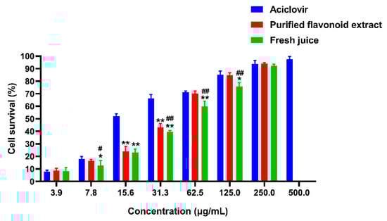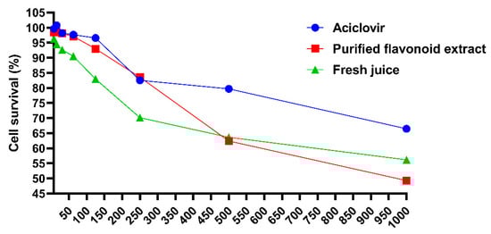 It is widely accepted that a compound is considered non-significantly toxic to cells if its absorbance ratio (absorbance of treated cells/absorbance of positive control) is ≥70% []. As shown in Figure 10, the maximum non-toxic concentrations of acyclovir, purified flavonoids, and fresh juice were determined to be 500 μg/mL, 250 μg/mL, and 250 μg/mL, respectively.