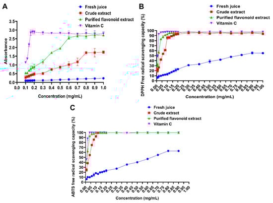 Vitamin C, purified flavonoid, crude extract, and fresh juice of Polygonum perfoliatum L. were lyophilized and dissolved in anhydrous ethanol to prepare solutions at concentrations of 0.10, 0.12, 0.14, 0.16, 0.18, 0.20, 0.3, 0.4, 0.5, 0.6, 0.7, 0.8, 0.9, and 1.0 mg/mL. A 1% potassium ferricyanide solution and 0.2 mol/L phosphate buffer (pH = 6.6) were added to each solution, mixed thoroughly, and incubated in a 50 °C water bath for 20 min. Subsequently, 10% trichloroacetic acid solution was added, then the solution was mixed and centrifuged. The supernatant was collected and reacted with 0.1% ferric chloride solution at room temperature for 15 min. The absorbance at 700 nm was measured using pure water as the blank []. Each measurement was performed in triplicate.