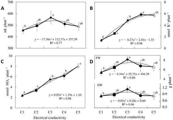 Water (A), potassium (B), and nitrate uptake (C) and fresh (FW) and dry weight (DW) (D) of S. irio grown under a soilless culture system versus different ECs of the nutrient solutions (C1, C2, C3, C4, and C5, corresponding to 2.0, 2.5, 3.0, 3.5, and 4.0 dS m−1, respectively). The dotted lines indicate the trend in the data. Different letters within the same series indicate significant differences among ECs (p < 0.05).