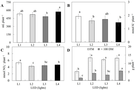 Water (A), potassium (B), and nitrate uptake (C) and fresh (FW) and dry weight (DW) (D) of S. irio grown under a soilless culture system versus spectrum of illumination. L1: L18 T8 Roblan®; L2: L18 AP67 Valoya®; L3: L18 NS1 Valoya®; and L4: L18 NS12 Valoya®. Different letters within the same series indicate significant differences among LEDs.