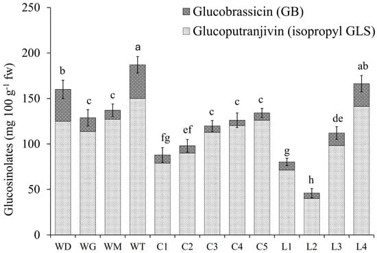 GLS profiles of S. irio shoots. Wild plants: WD, WG, WM, and WT. Samples from the EC trial: C1–C5. Samples from the lighting experiment: L1–L4. In a bar, means followed by different lower-case letters are significantly different at p < 0.05.