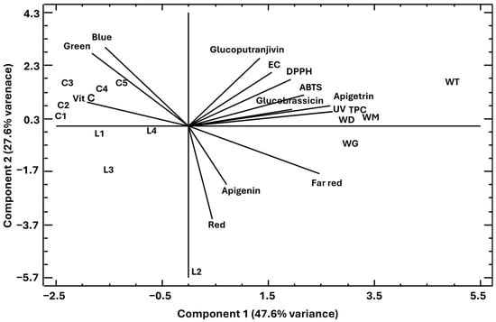 Samples from the lighting experiment (L1–L4) are roughly included in the quadrant of the plot for which both PC1 and PC2 have negative values, and none of the variables are included in this plot area. This means that the application of any of the checked lamps lacks the tendency to induce any biocompound synthesis or bioactivity development.